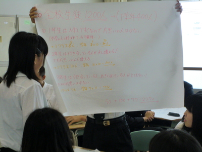 ②フェルミ推定(実際に調査するのが難しいとらえどころのない量を、いくつかの手掛かりをもとに論理的に推論し、短時間で概算)→「専大附属の学内で片思いしている人は何人いるでしょうか?」