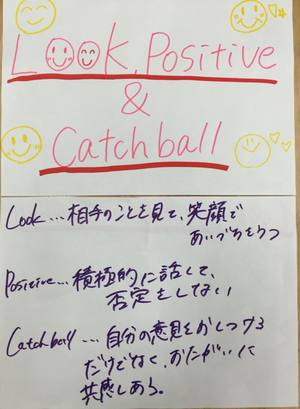 接戦の末、2015年度チーム作り講座における理想の傾聴は「Look,Positive&Catchball」になりました。以下生徒による定義になります。