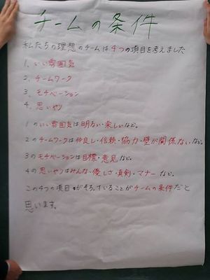 2時間目の話し合いでは、各チーム最終的には素敵な「理想のチーム」が考えられたのではないかと思います。(画像はその中でもとても上手にまとめてプレゼンしたチームの模造紙です。)
