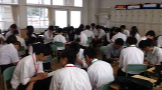 ①夏の思い出:イスを円にしておき、各自好きな席に着席。そのままの状態で、一人一言名前&夏の思い出&2学期の目標を語る。ファシリテーターは、何かしらのキーワードを黒板に書き残し、受講者全員の「思い出」を視覚的に共有できる状況を作る。